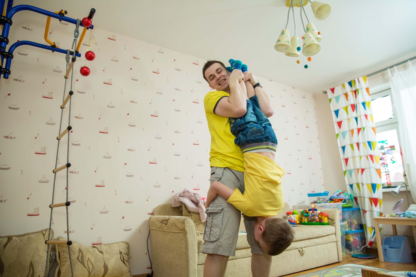 Семья дома и катается с горки